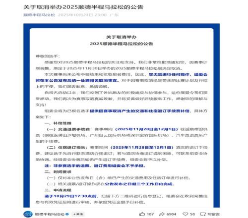 10月24日23时,顺德半程马拉松组委会发布通告,称因赛事计划调整,原定于2025年11月30日举办的2025顺德半程马拉松,决定取消。