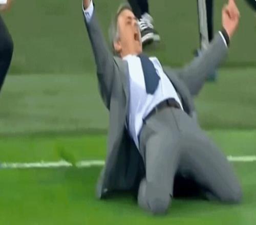 14年前,也就是2012年11月,皇马3-2绝杀曼城,在C罗打进最后进球后,穆里尼奥再度滑跪庆祝。